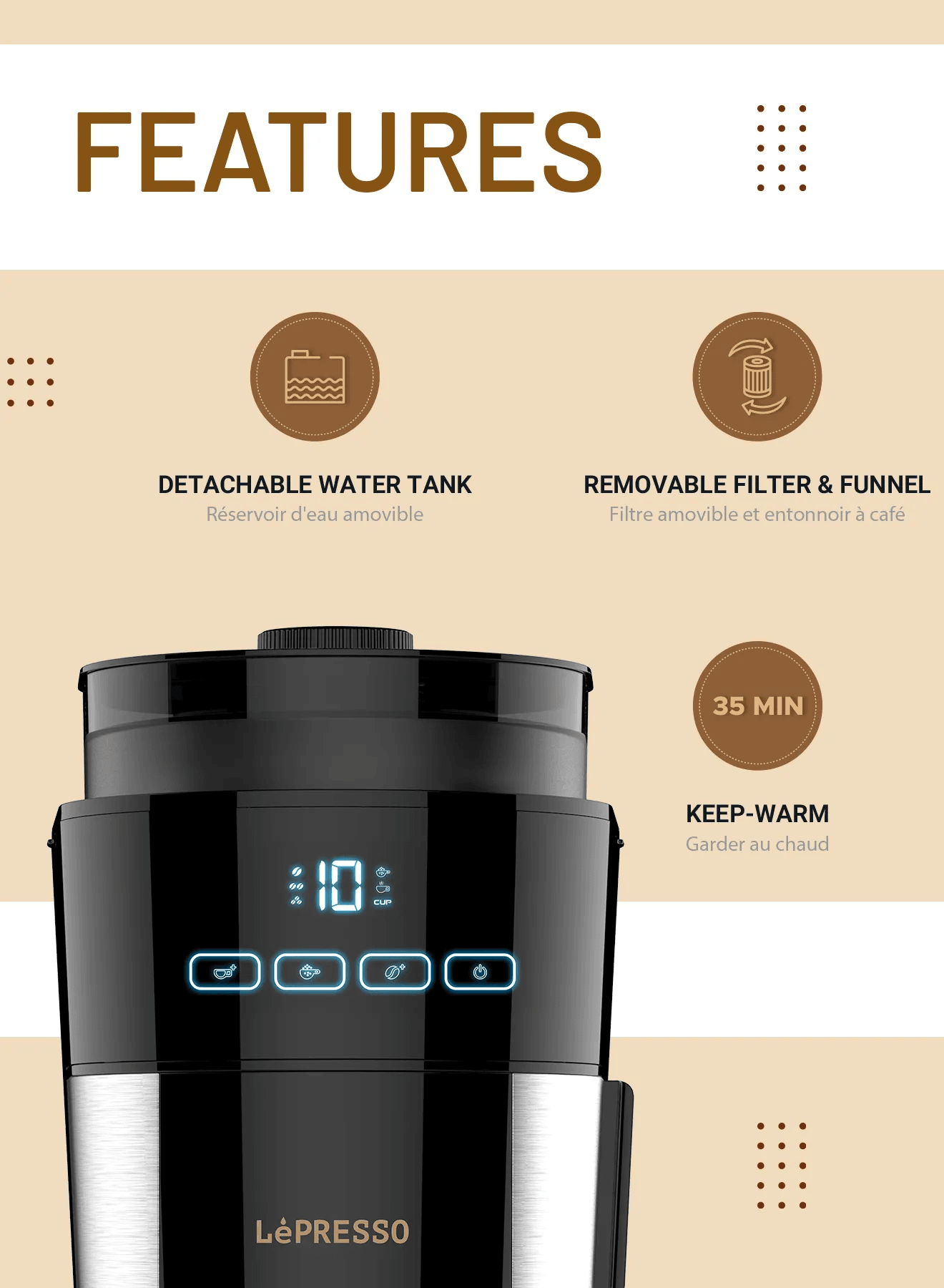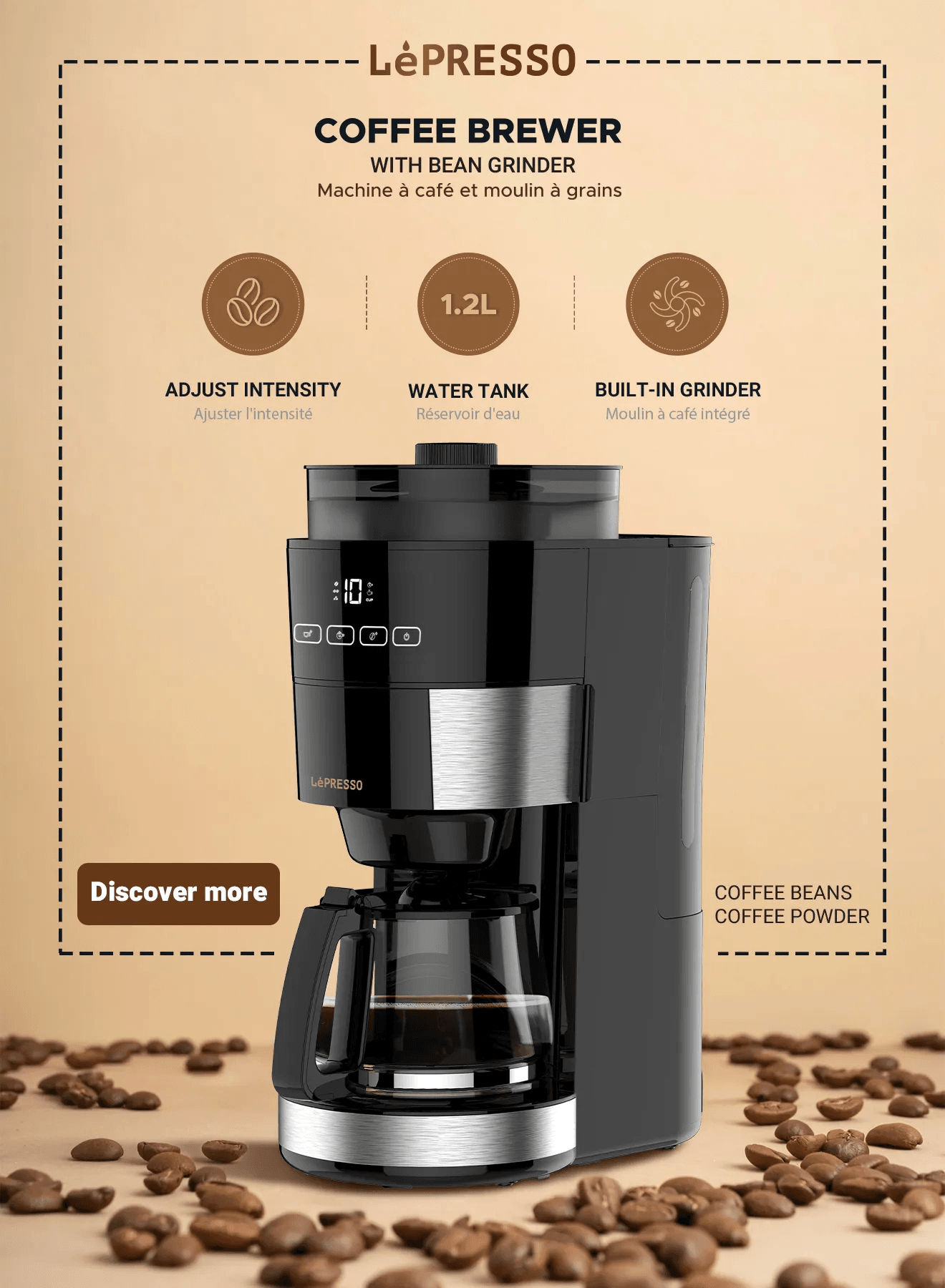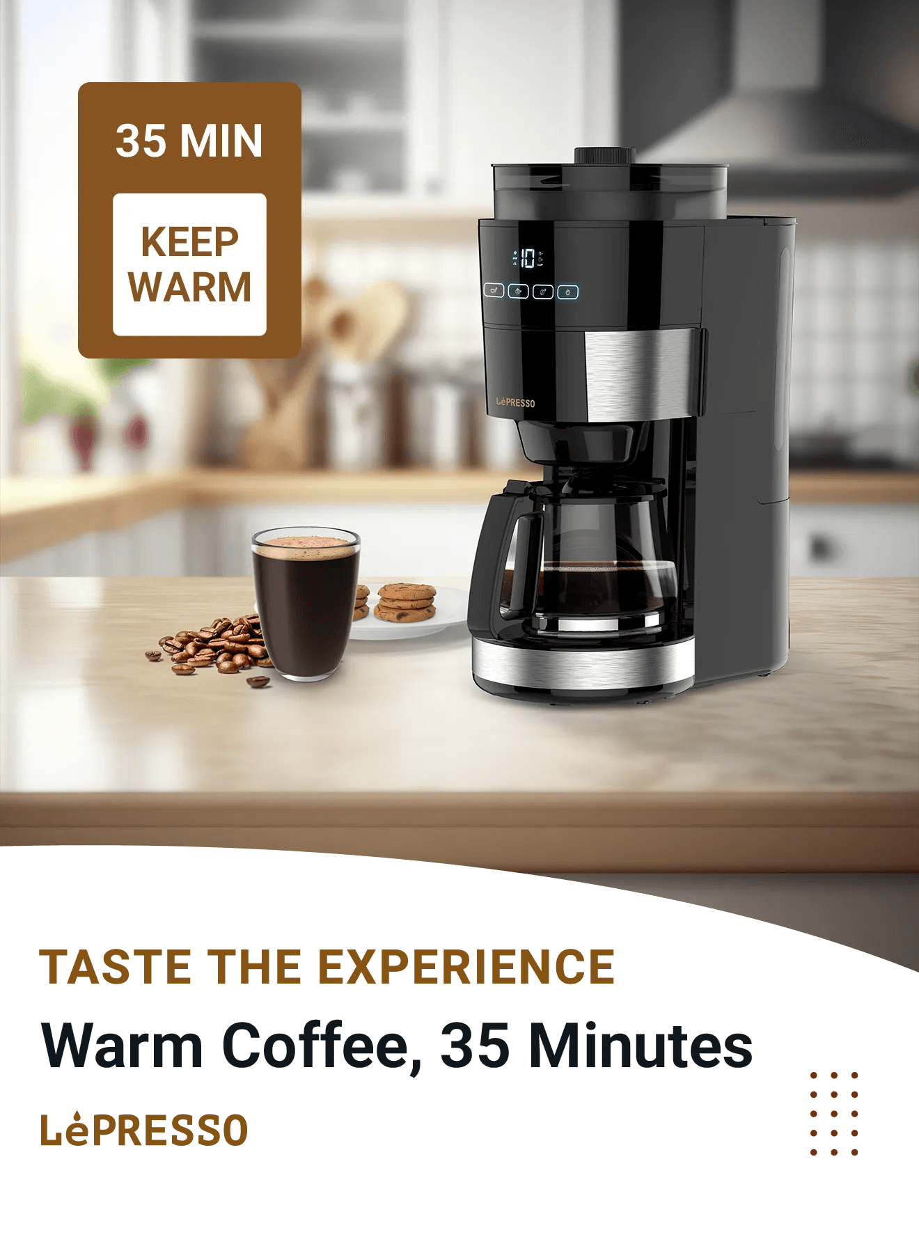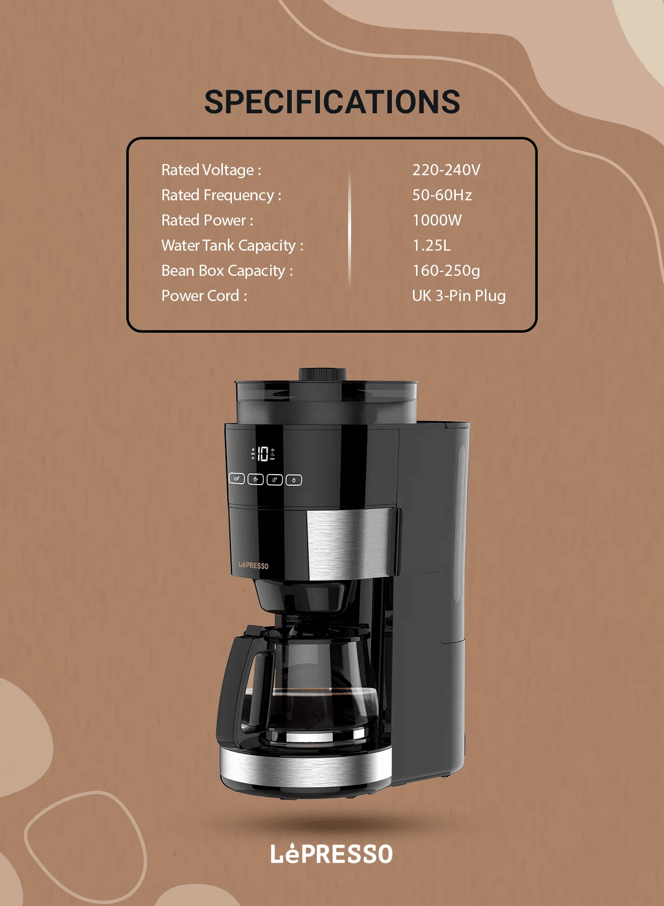 ماكينة طحن قهوة LePresso سعة 1.2 لتر و10 أكواب مع قاعدة تسخين ومقبس BS