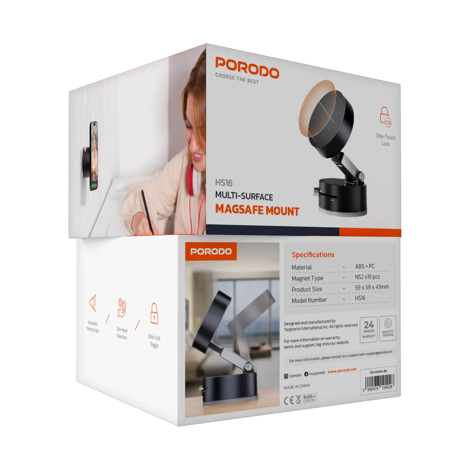 The Porodo Universal Adjustable Foldable MagSafe Car Phone Mount – Black delivers secure, MagSafe-compatible mounting for effortless hands-free use while driving. Designed with a strong magnetic grip, it safely holds MagSafe-enabled iPhones and compatible magnetic cases, keeping your device stable on bumpy roads. The adjustable and foldable arm allows you to position your phone at the perfect height and angle for GPS navigation, calls, or music control. With a sleek black finish and a 360° rotating head, this mount combines style, flexibility, and convenience to make every journey safer and smarter.
