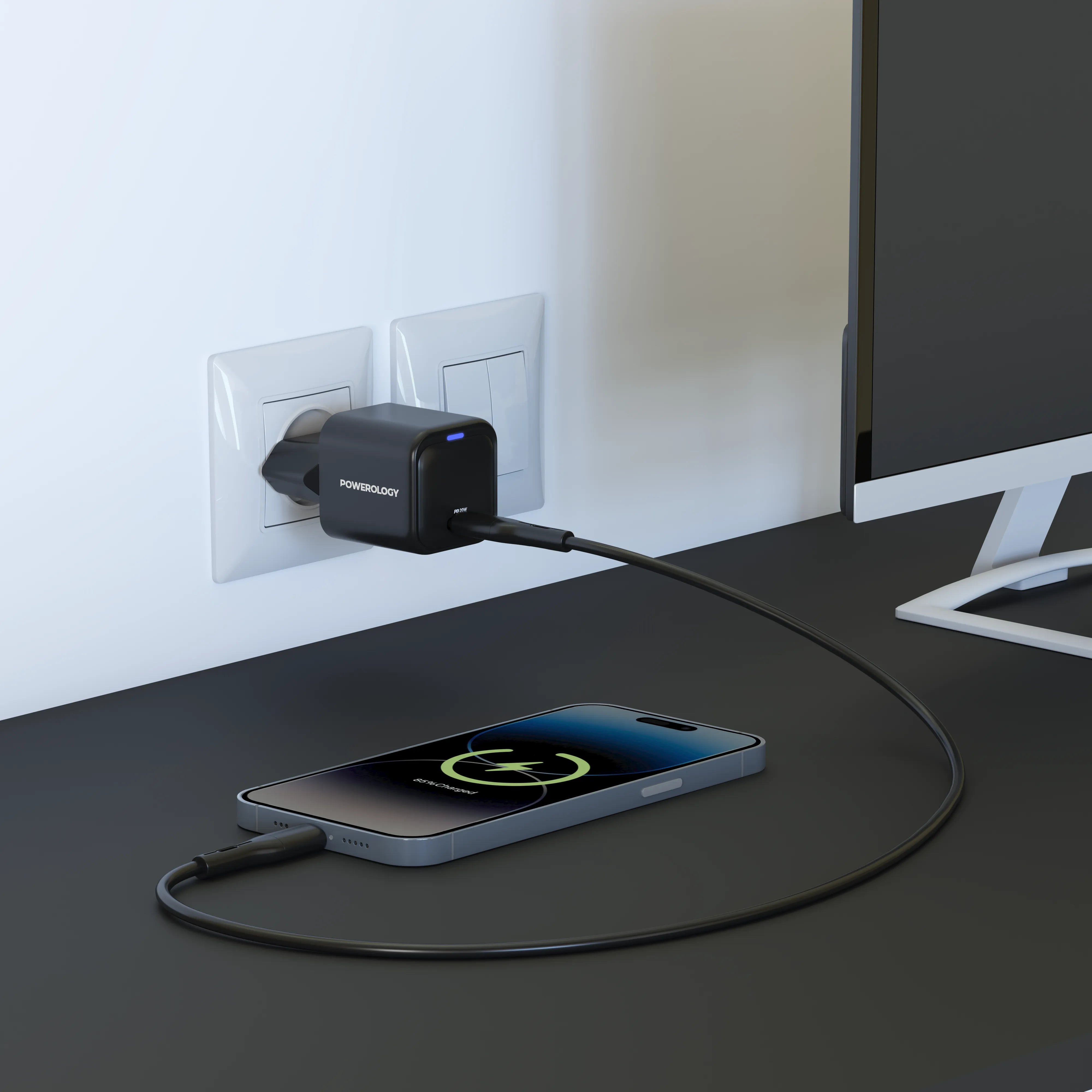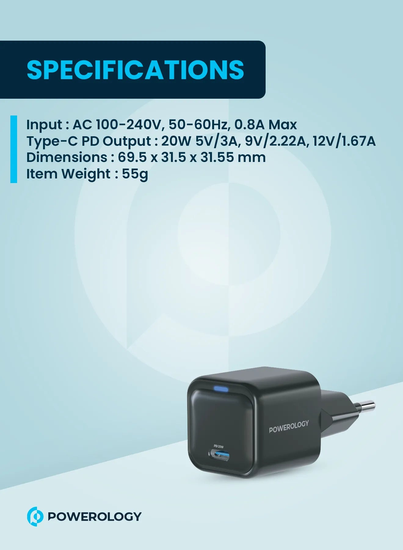 Charge your devices quickly and efficiently with the Powereology Ultra-Compact 20W GaN Charger, designed for maximum portability without compromising performance.