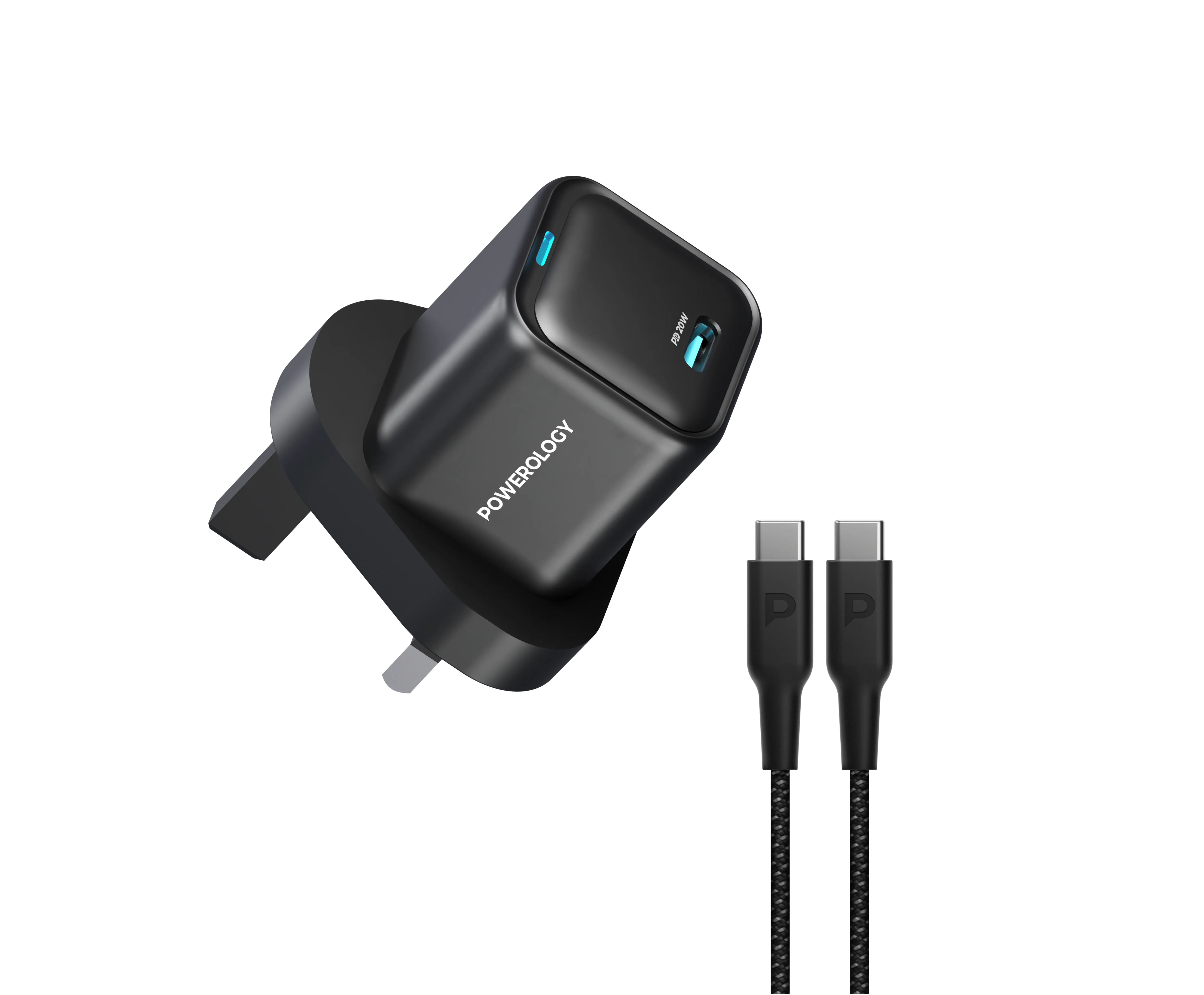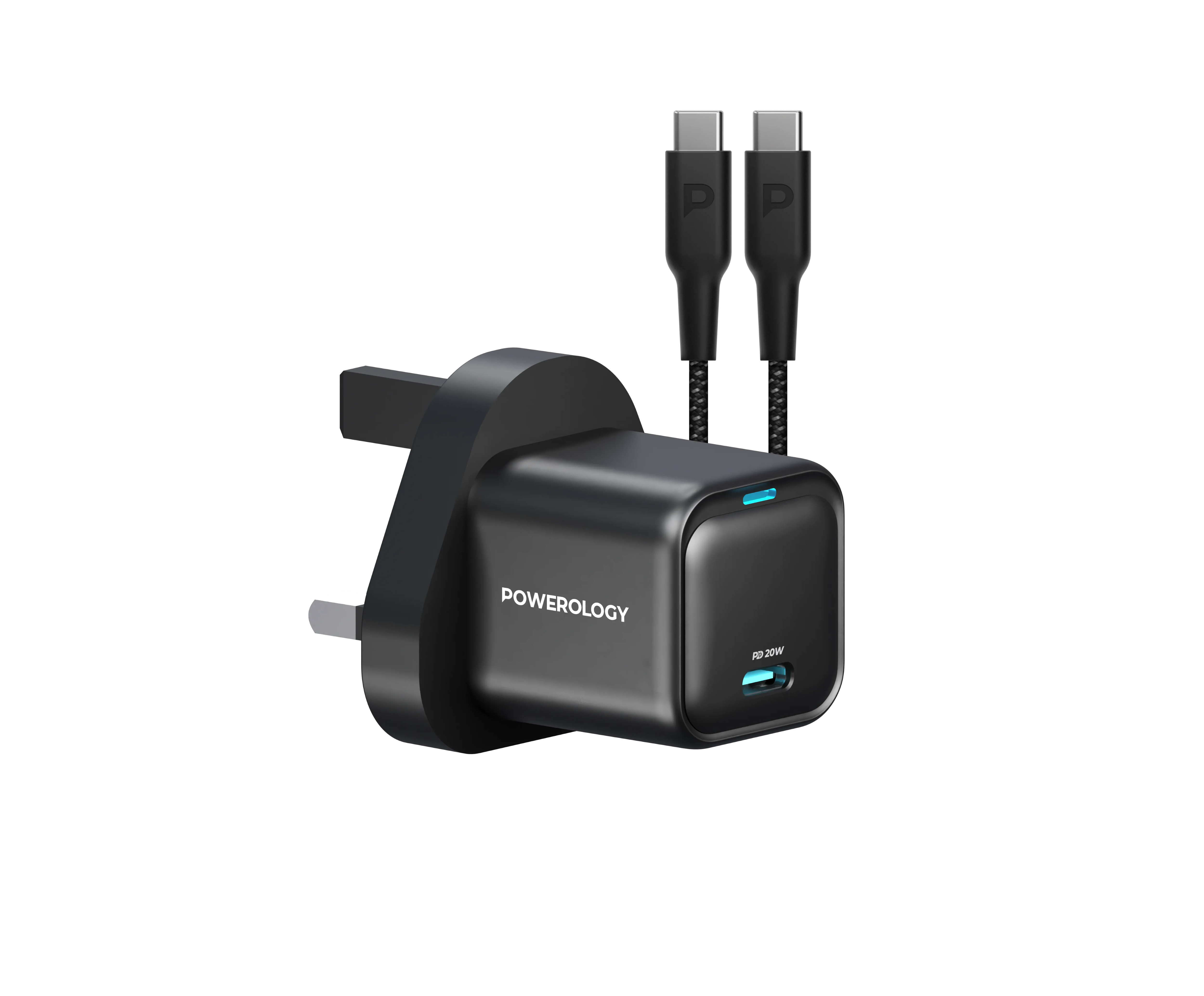 Powereology 20W Single USB-C PD Charger – Black (UK Plug) with 60W USB-C to USB-C Cable