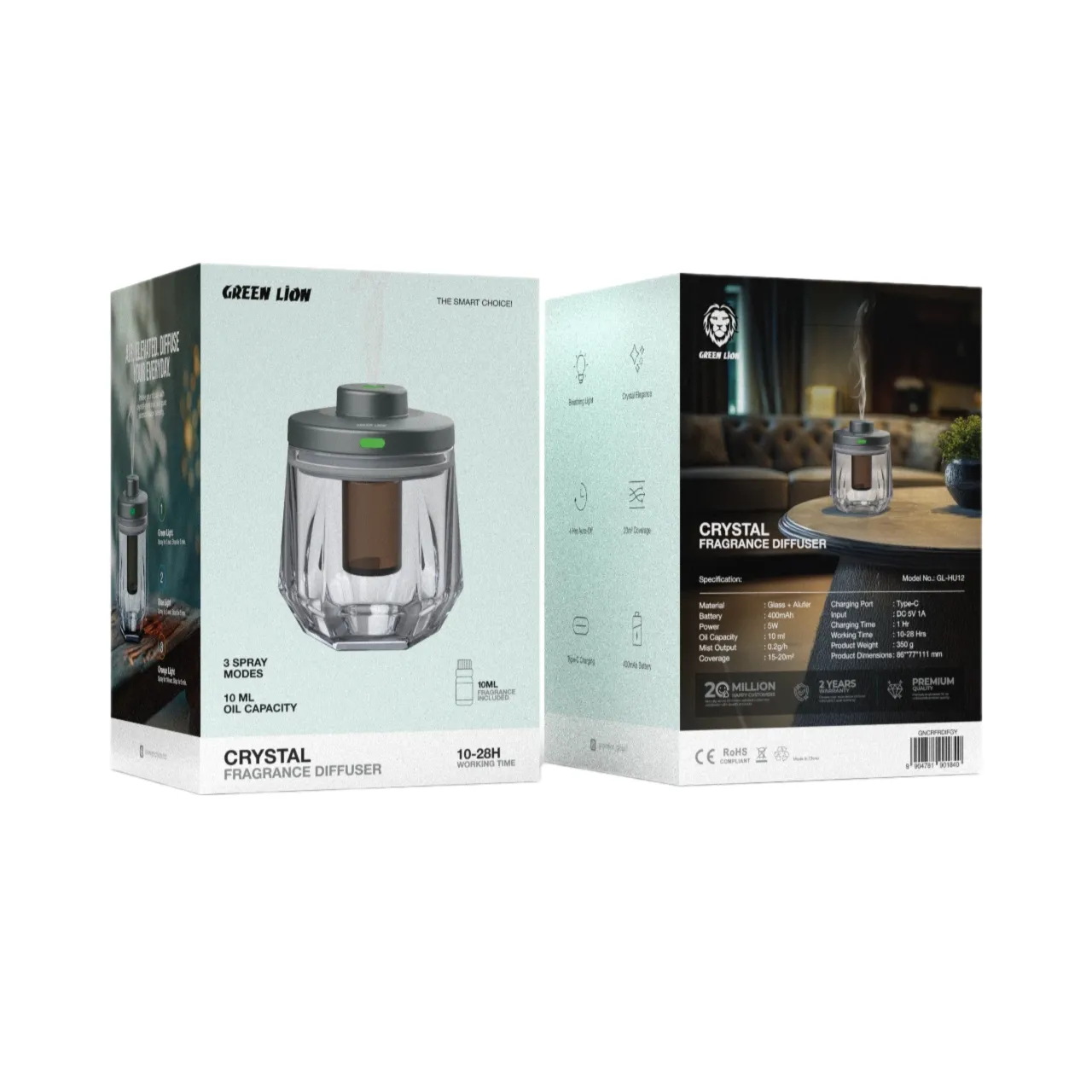 Elevate your space with the GREEN LION Crystal Fragrance Diffuser in sophisticated gray. Designed to disperse essential oils gently, this diffuser creates a soothing and fragrant atmosphere for home, office, or personal spaces. Its elegant crystal-inspired design adds a touch of style while providing long-lasting aroma and relaxation. Compact, durable, and visually appealing, it’s perfect for anyone seeking both functionality and aesthetic charm.