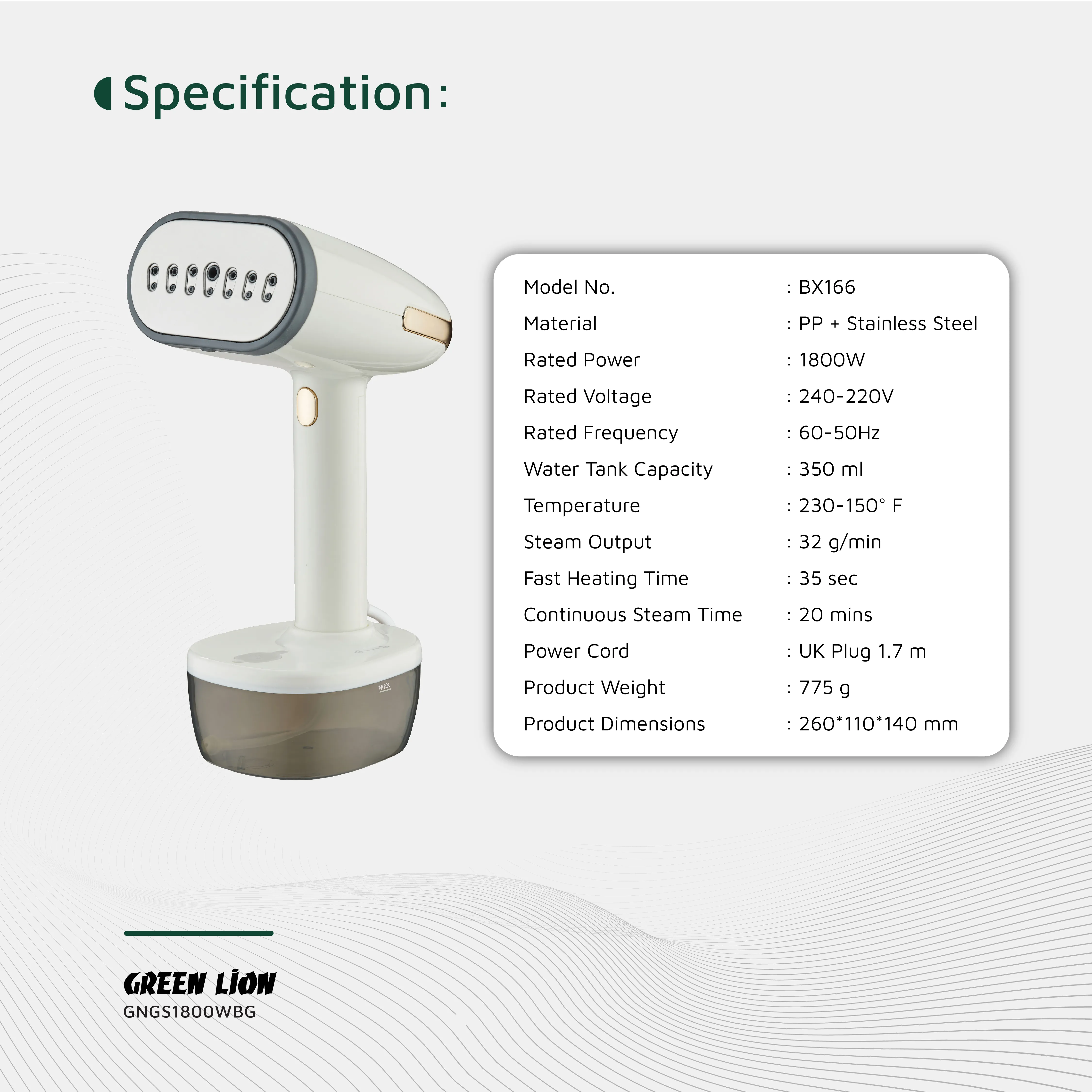 Keep your clothes wrinkle-free with the GREEN LION Garment Steamer 1800W in elegant beige. Designed for home or travel use, this powerful steamer provides quick and efficient steaming, making it perfect for shirts, dresses, suits, and delicate fabrics. Its compact and lightweight design ensures easy handling and portability, while the 1800W power delivers consistent performance for fast results. Achieve professional-looking garments effortlessly with this reliable and stylish steamer.