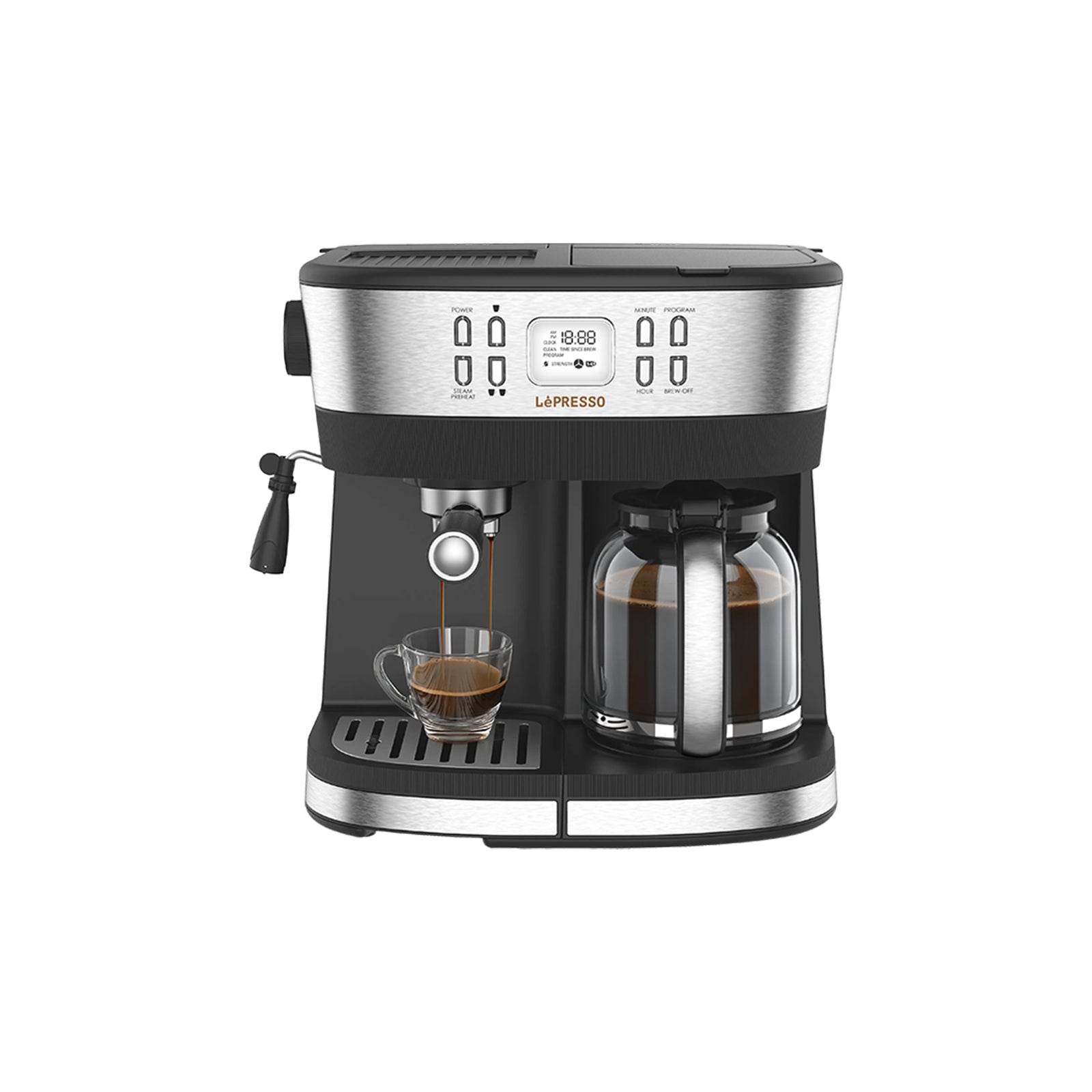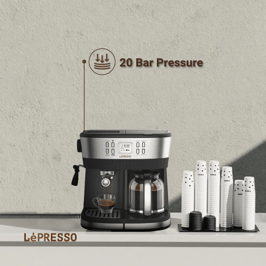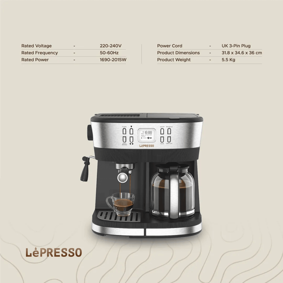 Start your day off ideally with the LePresso Dual Brew Drip Coffee & Espresso in stylish Black. This versatile coffee maker melds drip coffee convenience with espresso richness for a complete coffee brewing experience. Equipped with rated voltage 220-240V, rated frequency 50-60Hz, and rated power 1690-2015W, this machine promises consistent and stable performance, satisfying all your brewing needs. At the same time, it will be able to keep your coffee hot at an ideal temperature of 82°C to 88°C, full of satisfaction. The LePresso Dual Brew, with a 20 Bar pressure system, expresses maximum flavor and aroma from your coffee grounds for bold and full-bodied taste. The 10-cup coffee carafe will let you have enough brewing for yourself, your family, or even guests over for company-perfect, whether personally or socially. Brew the perfect cup of coffee with the variable coffee intensity feature to let you customize the strength of your coffee. In addition, a washable nylon filter makes maintenance a breeze and keeps the brewing process clean for a better quality of coffee. With its intuitive LCD display, monitoring and changes in the brewing process are always visually at your fingertips. The function of Keep Warm is to maintain the perfect temperature for 2 hours. It is equipped with a UK 3-Pin plug so that you may operate it at home or in an office environment.