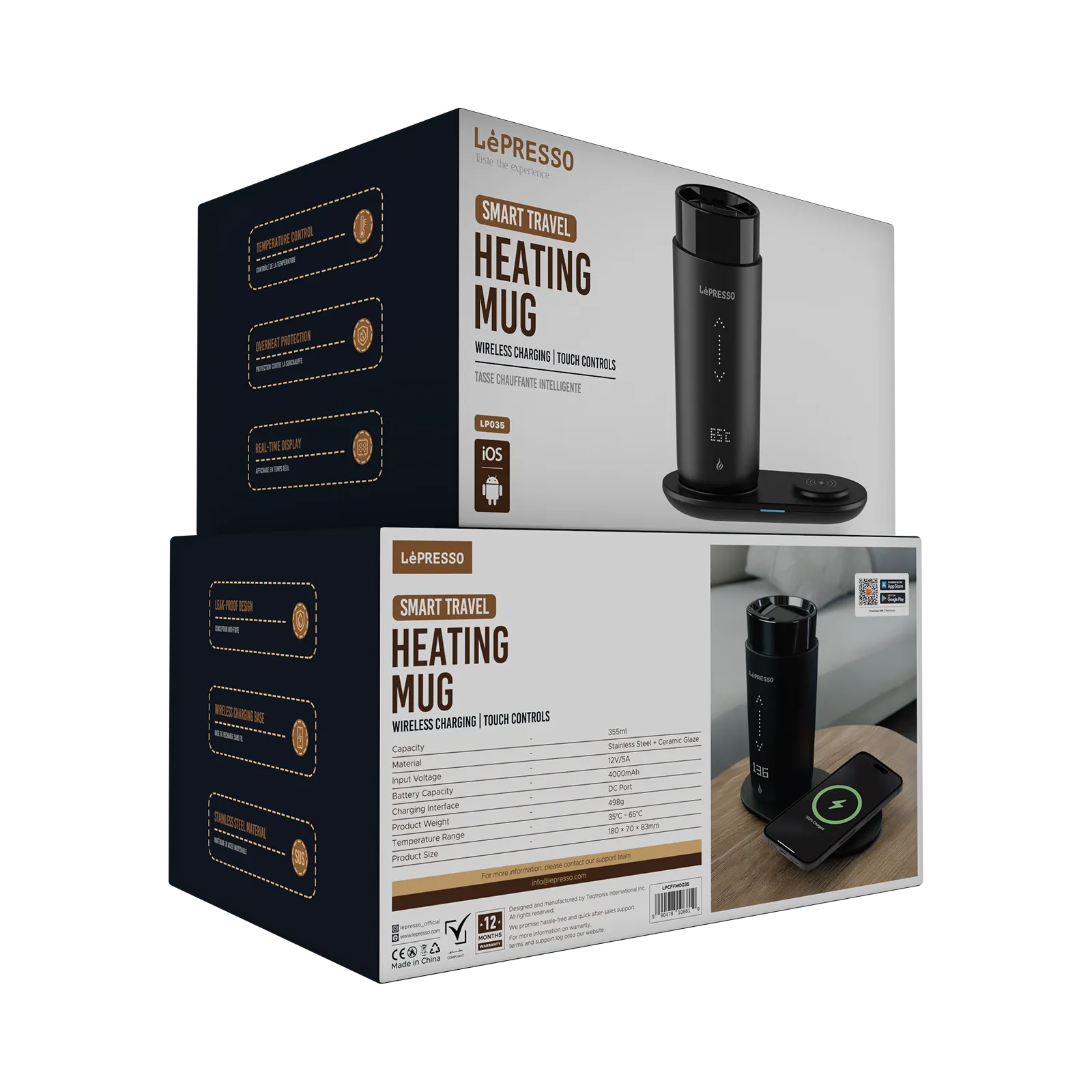 The Lepresso Smart Travel Heating Mug is for ultimate coffee lovers on the go. This sleek 355mL-capacity mug is made from superior stainless steel, with a smooth interior glaze in ceramic to ensure durability and a pure taste. Equipped with a 4000mAh battery and a 12V/5A input voltage, it keeps your beverages warm for a long time. Its intelligent temperature control enables setting one's preferred heat level in real-time through its friendly interface from 35°C to 65°C. Overheat protection and a leak-proof design make it suitable for traveling and commuting. This pack comes with a wireless charging base for added convenience. Power it up at home, in your car, or office. Enjoy every sip perfectly with the Lepresso Smart Travel Heating Mug.