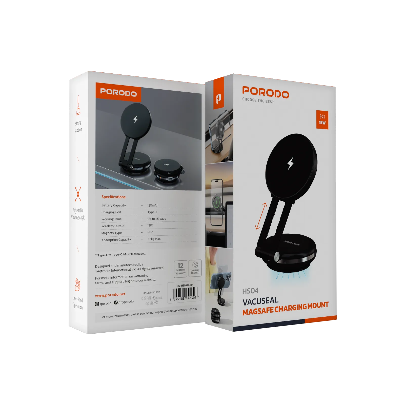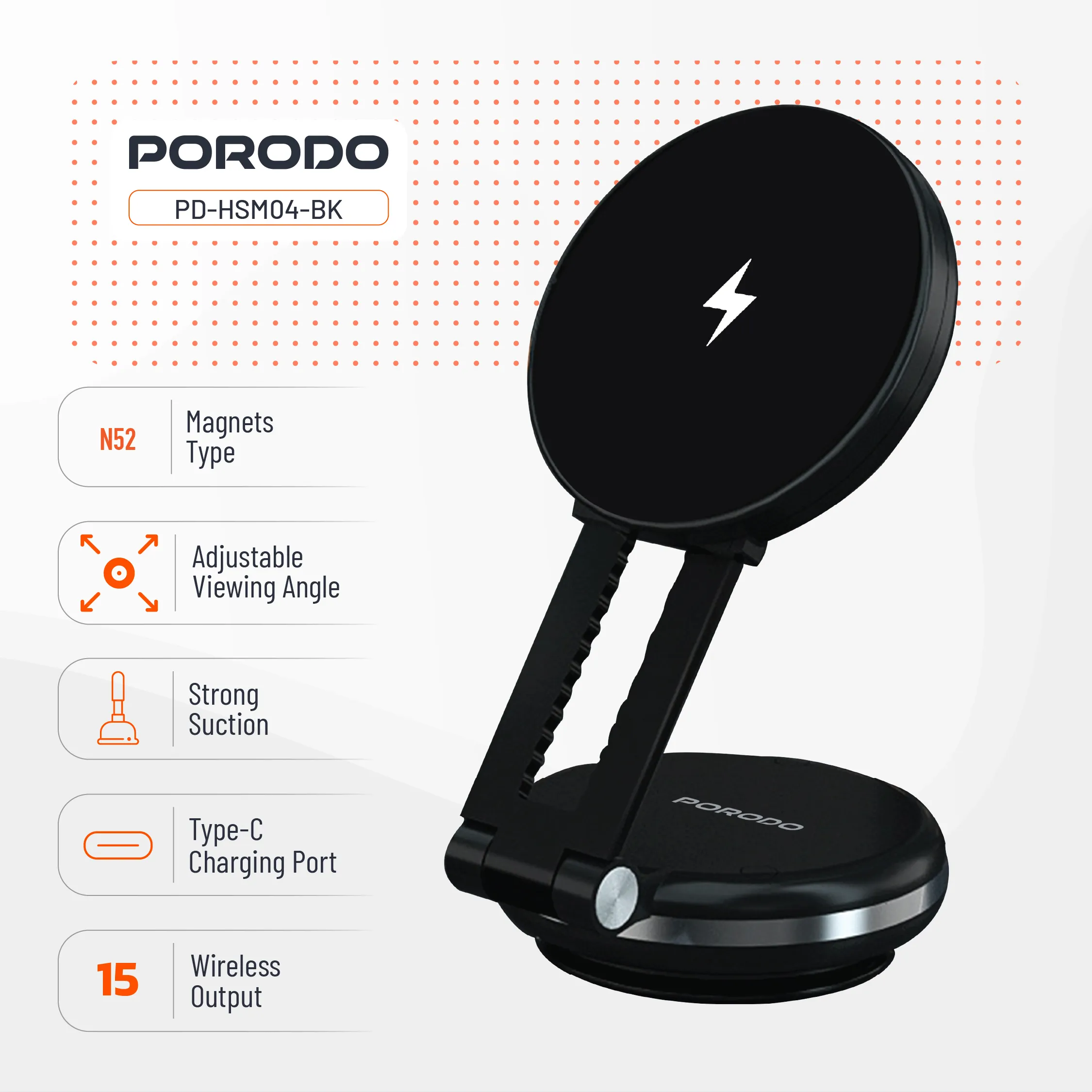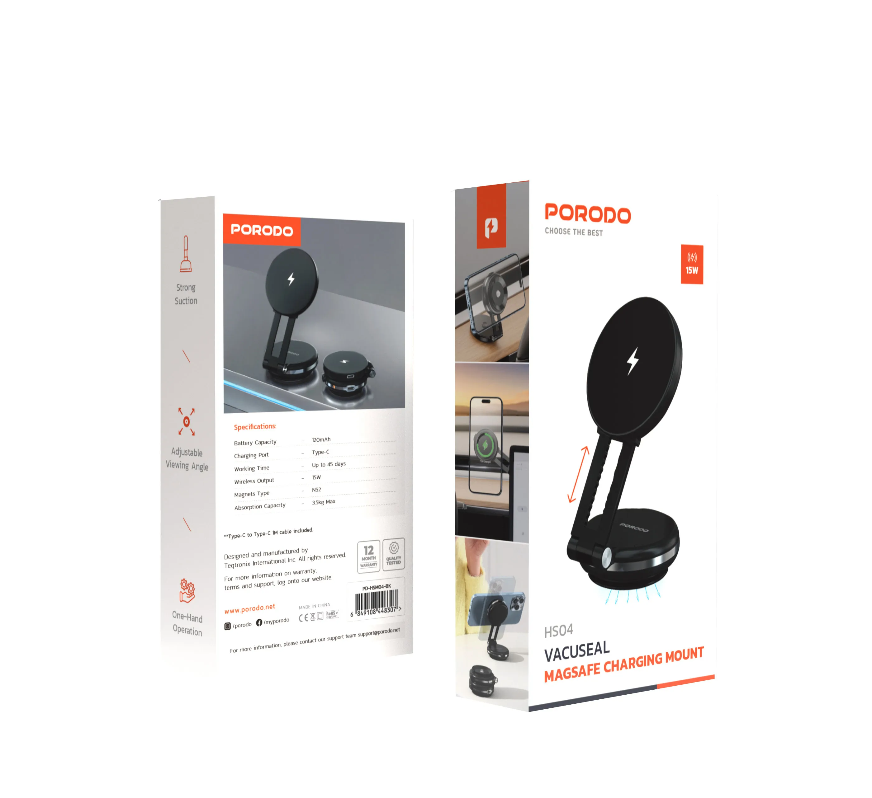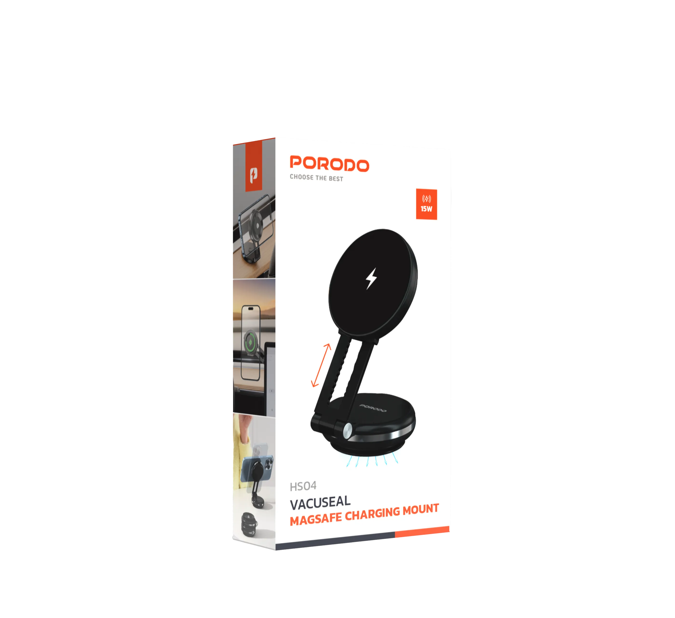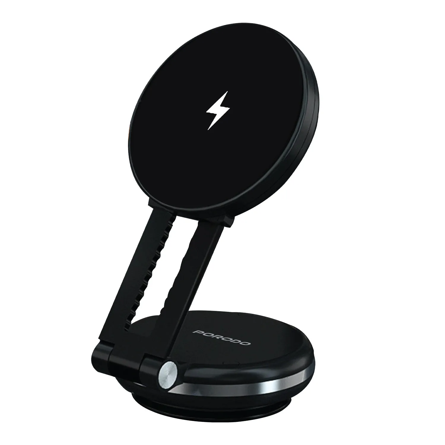 The Porodo 15W MagSafe Wireless Charger with Dual N52 Magnets – Foldable & Extendable Electric Stand is a premium charging solution built for fast, secure, and flexible wireless charging. Featuring strong dual N52 magnets, it provides a powerful magnetic grip for MagSafe-compatible iPhones, ensuring perfect alignment for efficient 15W charging. Its foldable and extendable electric stand allows you to adjust height and angle for comfortable viewing while charging—perfect for FaceTime, video calls, or hands-free use. Sleek and portable, it combines fast power delivery, stability, and modern design, making it ideal for home, office, or travel.