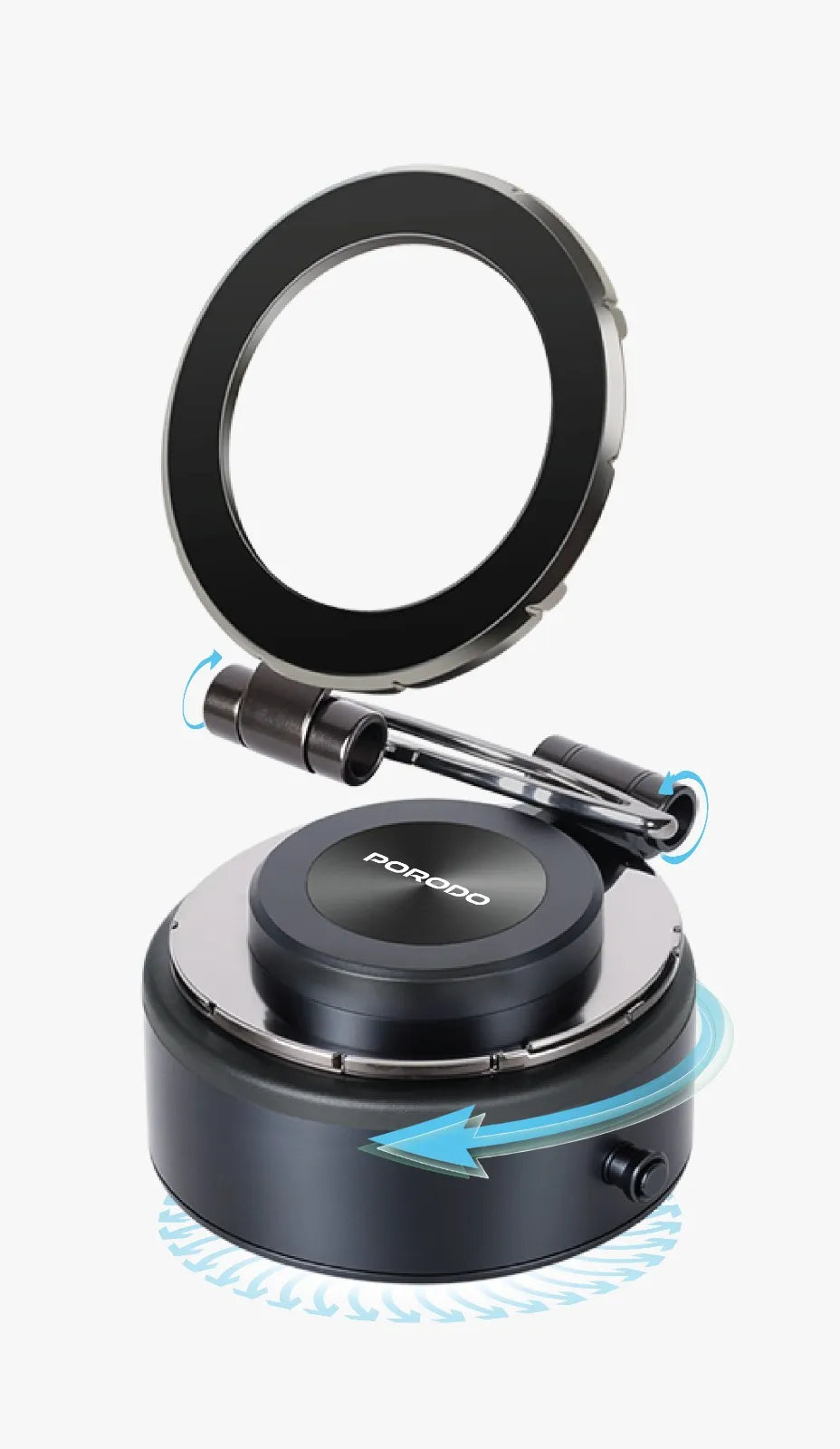 The Porodo Electric 360° Foldable MagSafe Holder – Black is a premium motorized phone stand designed for next-level convenience and style. Equipped with powerful MagSafe magnetic alignment, it securely holds your iPhone while offering 360° automatic rotation for perfect viewing from any angle. The foldable, space-saving design makes it easy to carry or store, while the electric swivel function is ideal for video calls, content creation, live streaming, or hands-free use. Whether at home, in the office, or on the go, this holder delivers a blend of modern functionality and sleek elegance.