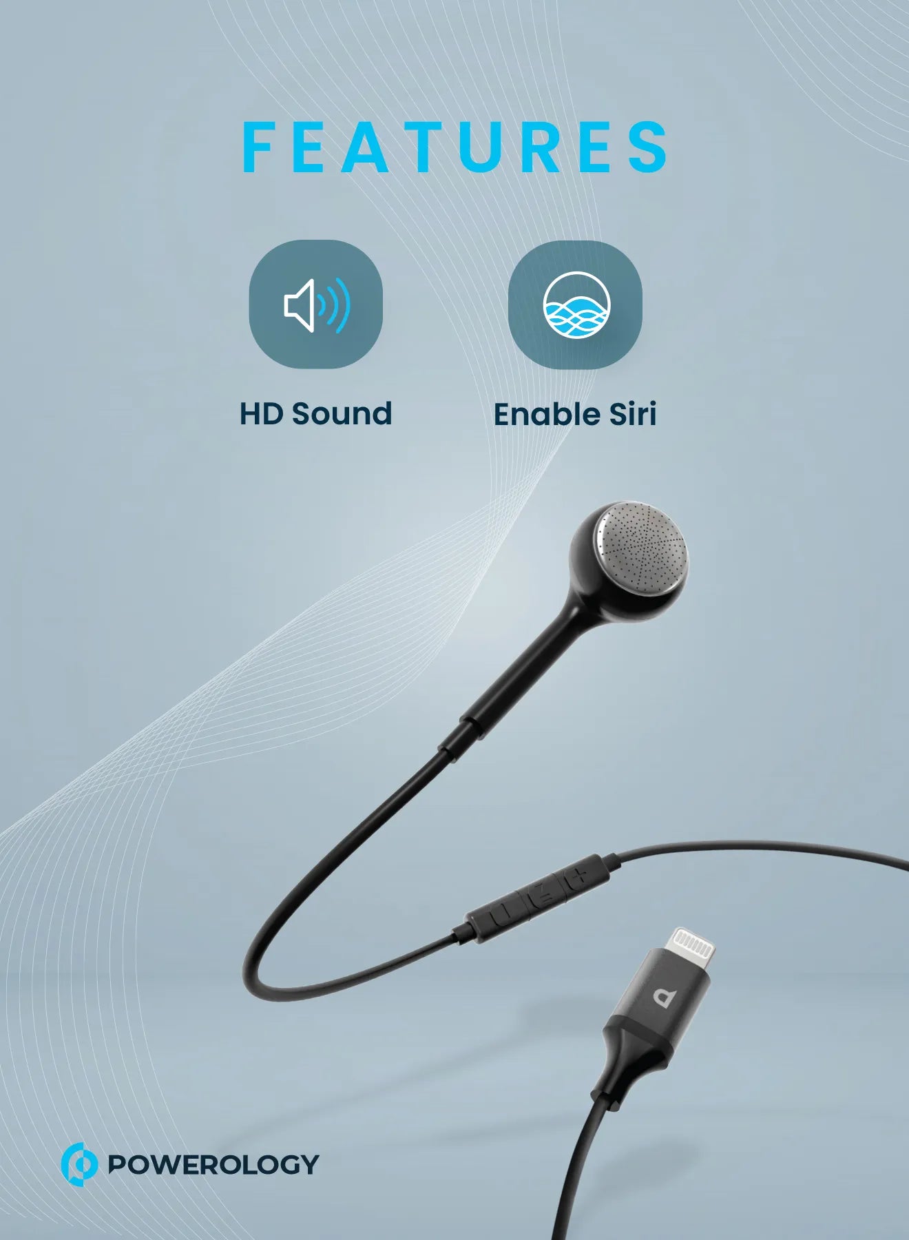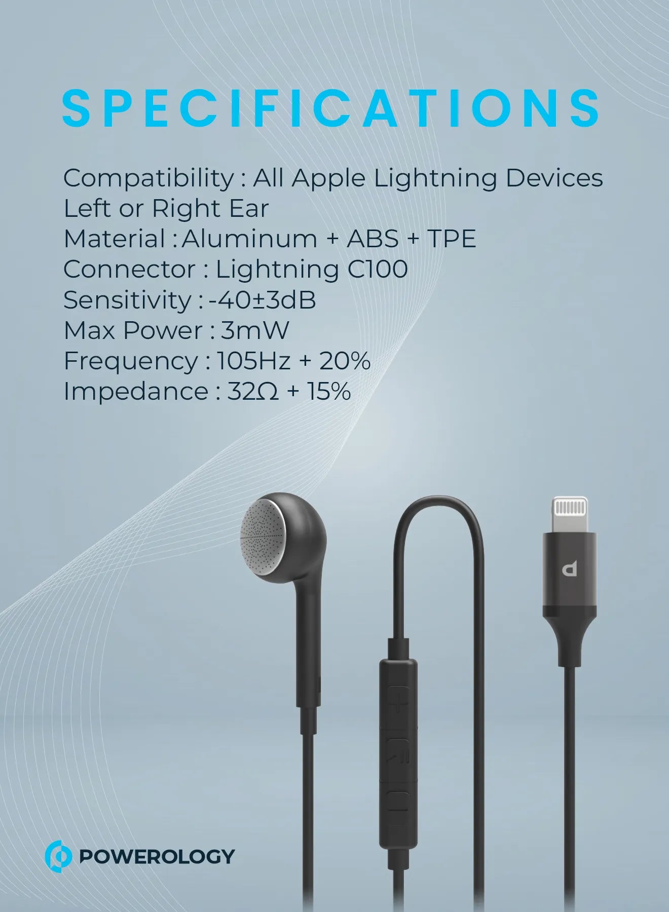 Powerology Mono Earphone is a single-ear earpiece with lightning connector design specifically for Apple devices. This device offers clean and clear HD sound transmission experience due to its high sensitivity of -40dB. This earplug has provided with Siri activator which enables you to receive calls and control music remotely. The lightning connector has 1.2m length that makes it more flexible and comfortable to use alongside MFI approval that ensures working without causing any harm to your Apple device's hardware or software, as they meet Apple's specific technical standards.